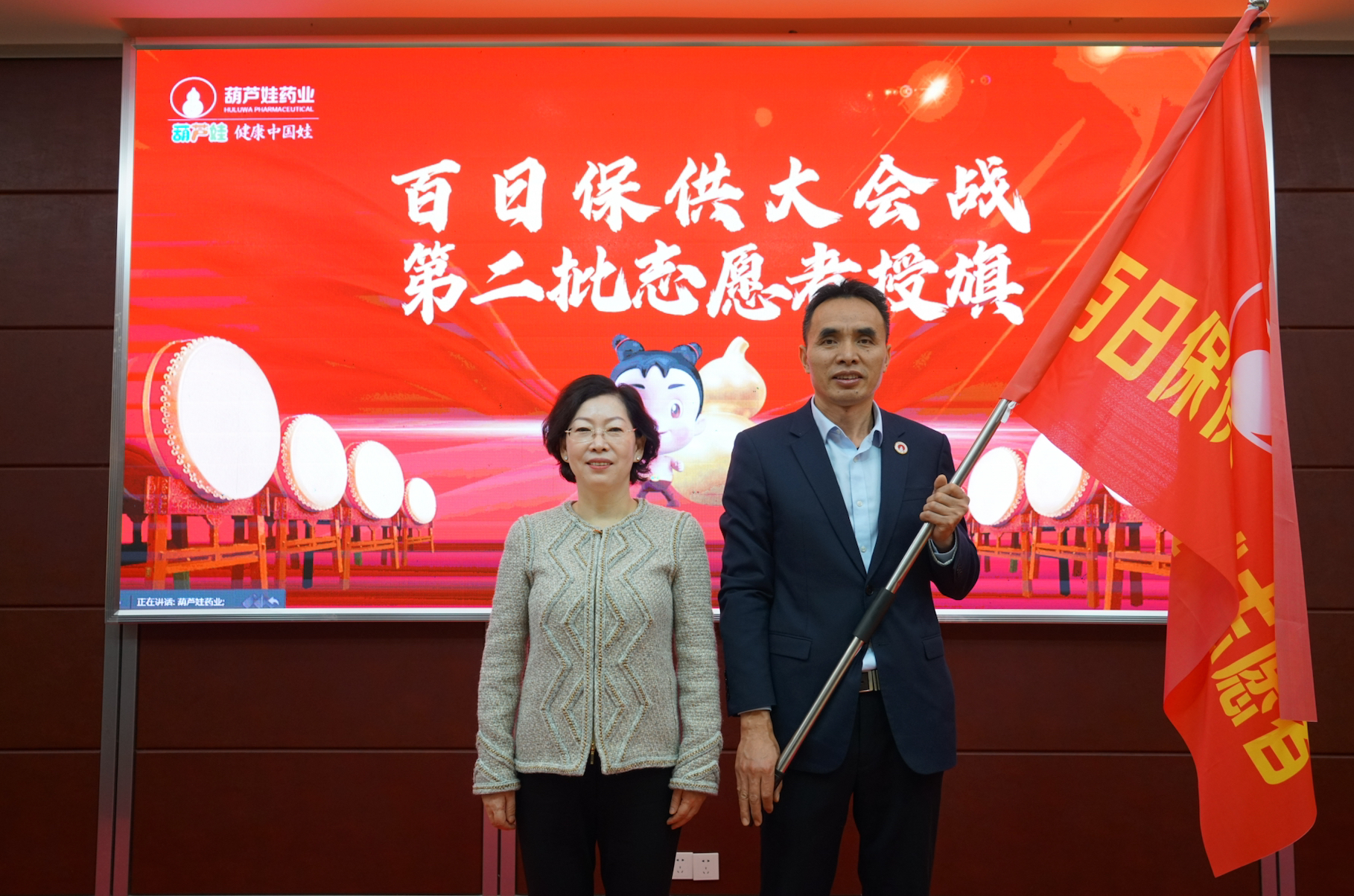 伴随着挥舞的旗帜,“百日保供,营销有我”的口号响彻会场。一句誓言,一面旗帜,一份使命,一种责任。当第二批志愿者海南组组长童元兵接过刘景萍董事长授予的旗帜时,也接过了保供生产沉甸甸的使命与责任。